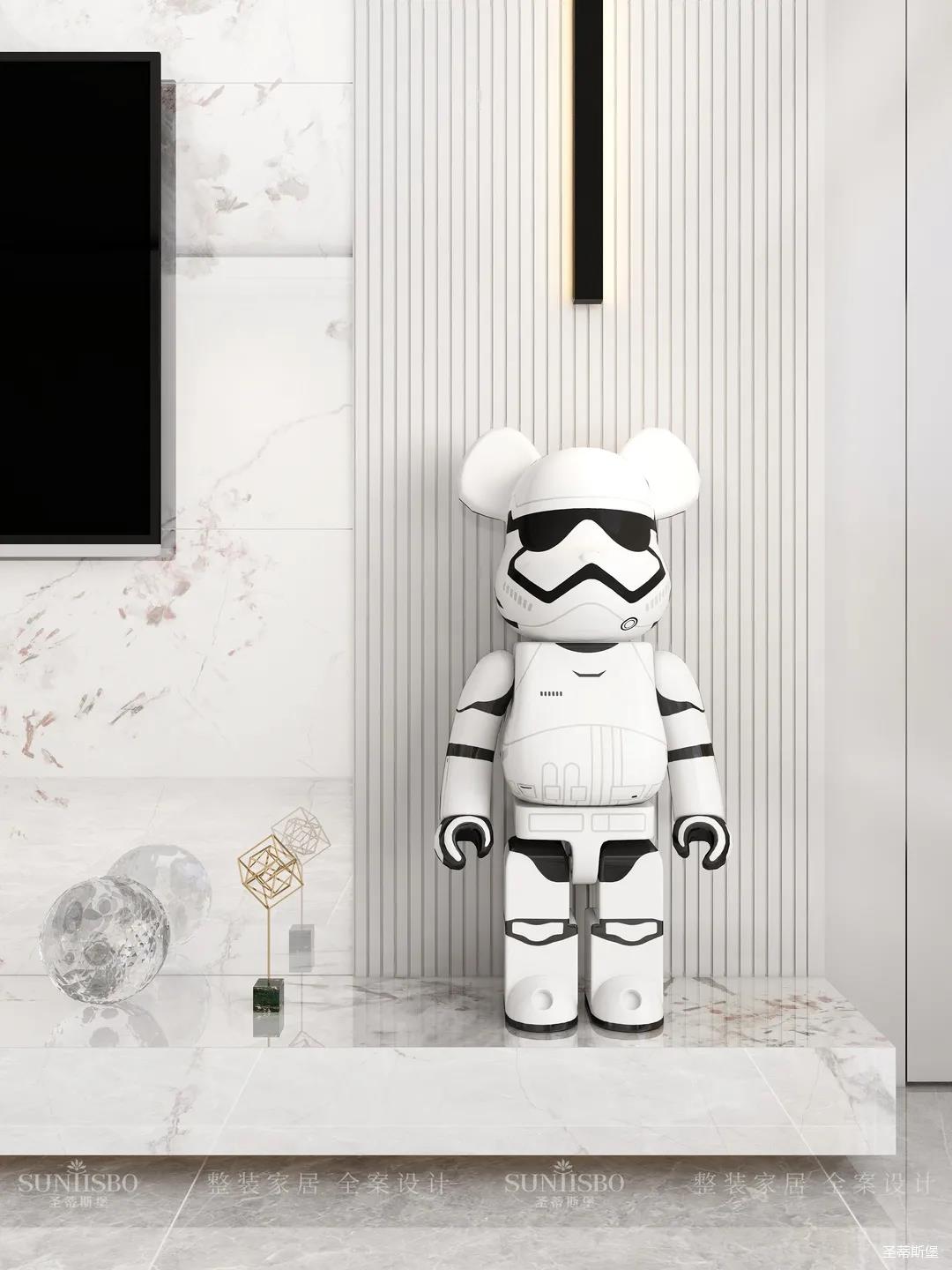 设计师通过业主需求说明,打破各个空间的区域界限,进行合理的空间调度,将美式轻奢风格与空间融合,为业主构筑一个流动、交互、有温度的生活空间。